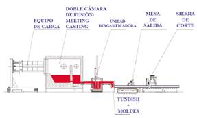 Por medio de la técnica de molde abierto se logra producir con un mismo equipo: lingotes, billets (cilindros), barras T, entre otros; cada uno de ellos con diferentes dimensiones y longitudes con la integración de un sistema con sierra de corte. En la Figura 1 se aprecia las partes principales del equipo de colada continua horizontal, además a |