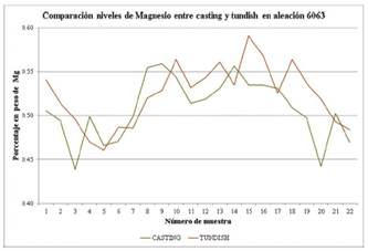 Figura 3. Comparación niveles de Mg entre casting y tundish.