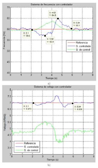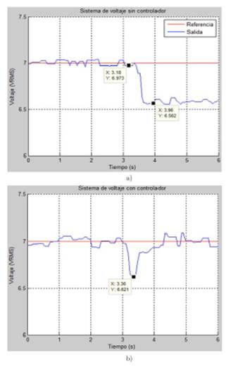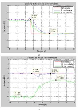 Figura 8. Comparación del sistema con y sin controlador ante la conexión de carga al sistema, a) respuesta sin controlador, b) respuesta con controlador.
