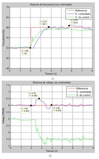 Figura 9. Respuesta del sistema con controlador y sin carga ante una variación en la referencia de la frecuencia, a) respuesta de frecuencia, b) respuesta de voltaje.