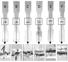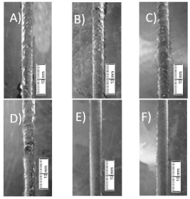 En la Figura 4 se muestra los aspectos superficiales de cada uno de las soldaduras para las diferentes velocidades de rotación de la herramienta según la Tabla 1. Se observa que para las probetas A, B, C, D la soldadura no tiene un buen acabado, mostrando discontinuidad en el cordón de soldadura y la presencia de pedazos de material que no han logrado forma la unión con el material base. Las probetas E y F muestran un buen acabado en la soldadura, sin embargo, en la probeta F tiene un acabado menor al de la probeta E.