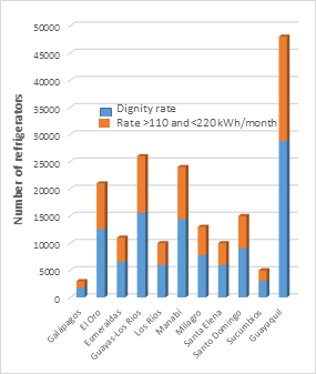 systems, it grew 16% [14]. It is important to mention that since 2013, projects with renewable energy sources connected to the National System have been incorporated, such as the Villonaco wind project and several photovoltaic parks. 2.2. Electricity demand in Ecuador. The electricity demand in the period of 1999-2011 had a growth rate of 5.8%. By February 2015, the total consumption, including technical and non-technical distribution losses, was 21,352.70 GWh, of which 6,537.42 GWh were from residential consumption, 3,873.93 GWh were from commercial consumption, 5,834.17 GWh were from industrial consumption, 1,046.39 GWh were from street lighting consumption, and 1,882 GWh were from other consumption sources [12]. The technical and non-technical distribution losses in the electrical consumption were 1,736.08 GWh (8.13%) and 892.70 GWh (4.18%), respectively (see Table 3). According to the 2010 Population and Housing Census by the National Institute of Statistics and Censuses (Instituto Nacional de Estadísticas y Censos - INEC), the total percentage of dwellings with electric power reached 94.77%, in the urban area, while it was 89.03% in rural areas [15]. The Guayas province has the highest number of subscribers, the same as in the year 2010, when 43,548 households without access to electricity it ware recorded, which corresponds to approximately 5% of the provincial total. These problems are also evident in other provinces, especially those that are located in the eastern part of the country. In this regard the Ministry of Electricity and Renewable Energy - MEER According to the institutional strategic plan 2014-2017, aims to cover 96,88% of the national electricity service of the public distribution. Until 2010, the characterization of the consumption of end uses of electricity for residential customers of Ecuador had not been updated, therefore it had only the study conducted in 1991 and data was insufficient to be used as a basis for the development of the domestic refrigerators renewal plan. For this reason in 2010 MEER, through consultancy, conducted a new analysis of some cities’ energy consumption in lighting, cooling, water heating and other (in this category is cooking with electricity) and determined that residential consumption in Ecuador for the 2010 represented 35% of the national electrical consumption [16]. The development of the study of end uses of energy was based on the measurement and construction of load curves and use perception surveys. The results showed that increased consumption was generated by the use of domestic refrigeration equipment, with an average of 43.2% in relation to the residential consumption. |
